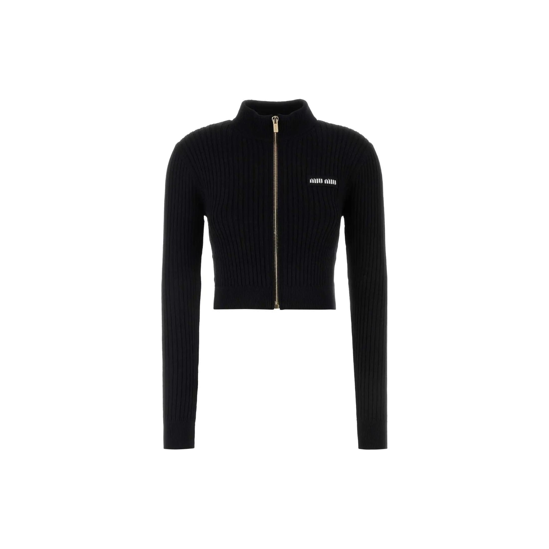 MIU MIU Logo Detailed Zip-Up Knitted Cardigan Black